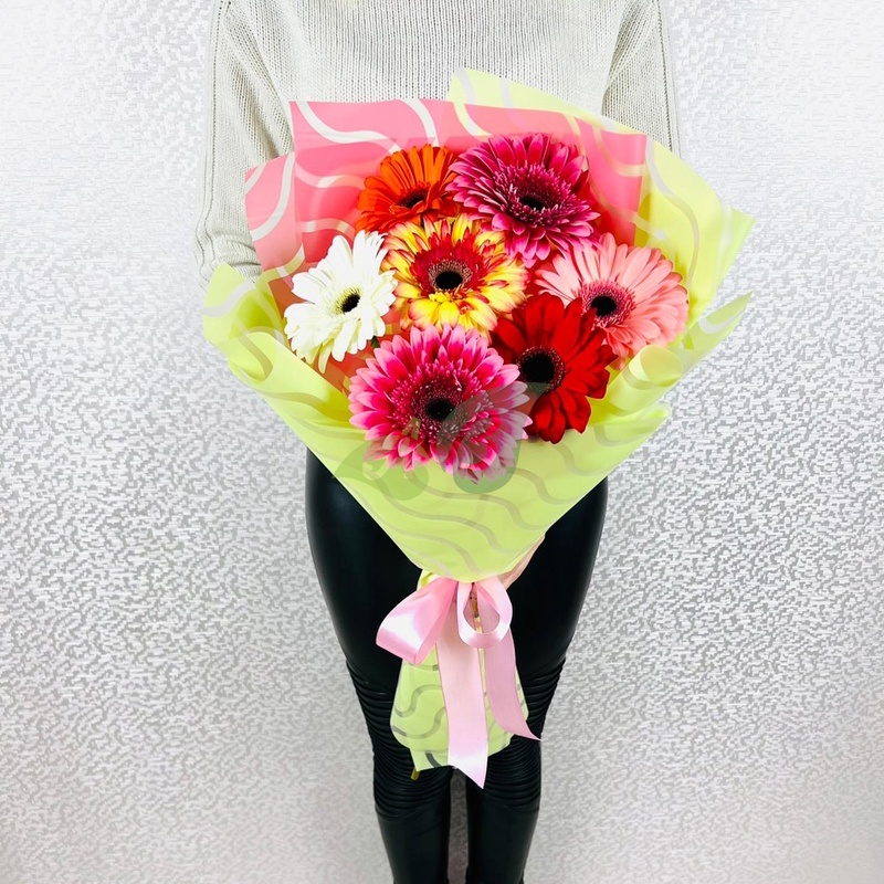 • Гербера - 7 штук, цвет - красный, жёлтый, оранжевый, длина стебля - 50 см;
