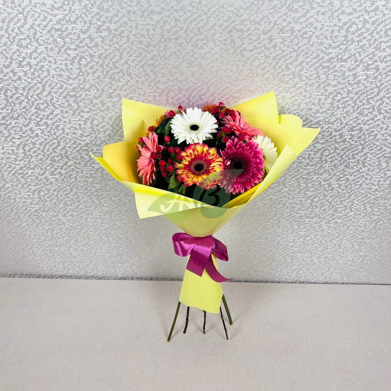 - Гербера - 11 штук, цвет - красный, жёлтый, оранжевый, длина стебля - 50 см;