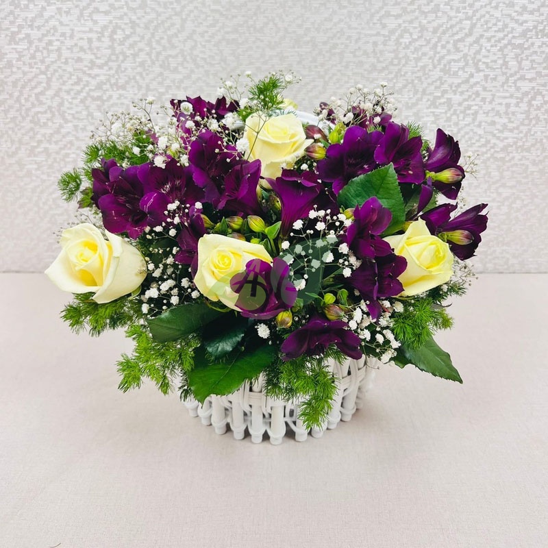 Розы и альстромерии в корзине