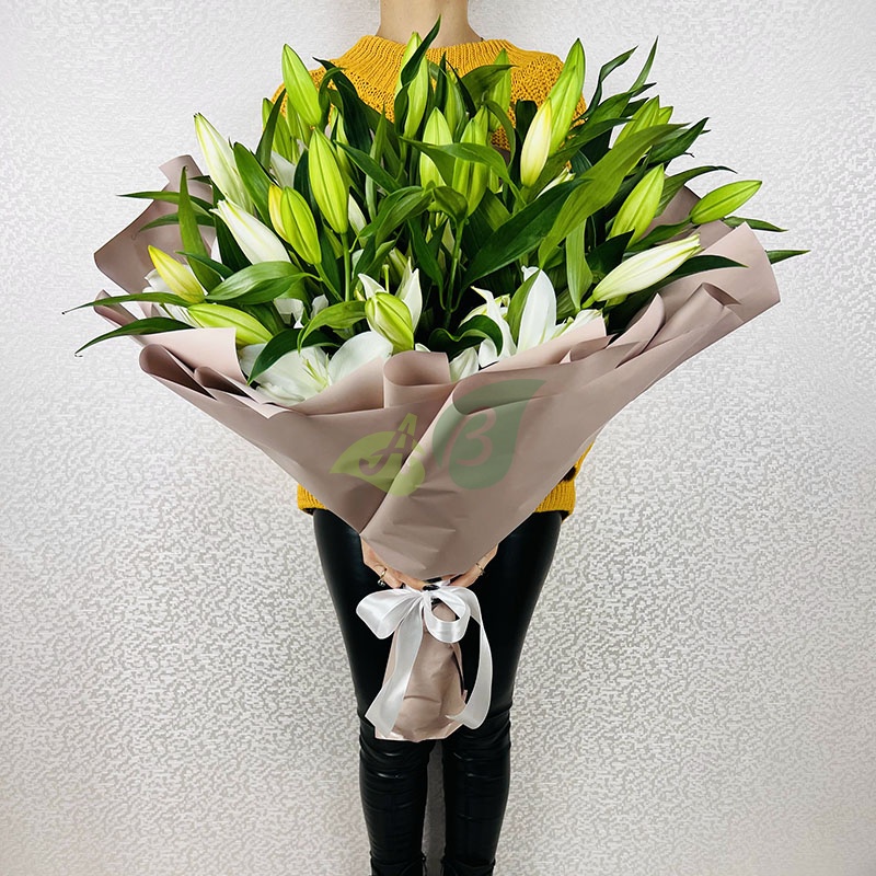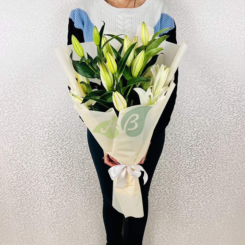 Наши флористы не используют дополнительных украшений для лилий. Ведь букет из этих величественных цветов красив и без лишней мишуры.
